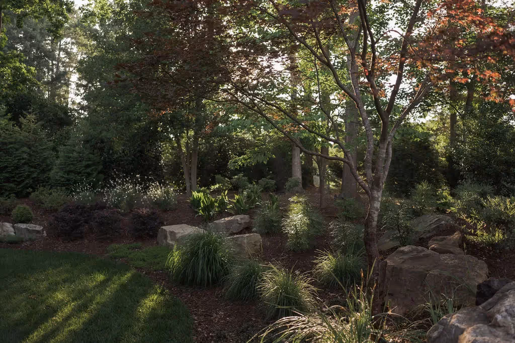 Mountain laurel, rhododendron, native grasses, ferns, and perennials like echinacea thrive in this environment. We select plants based on microclimates across your property.