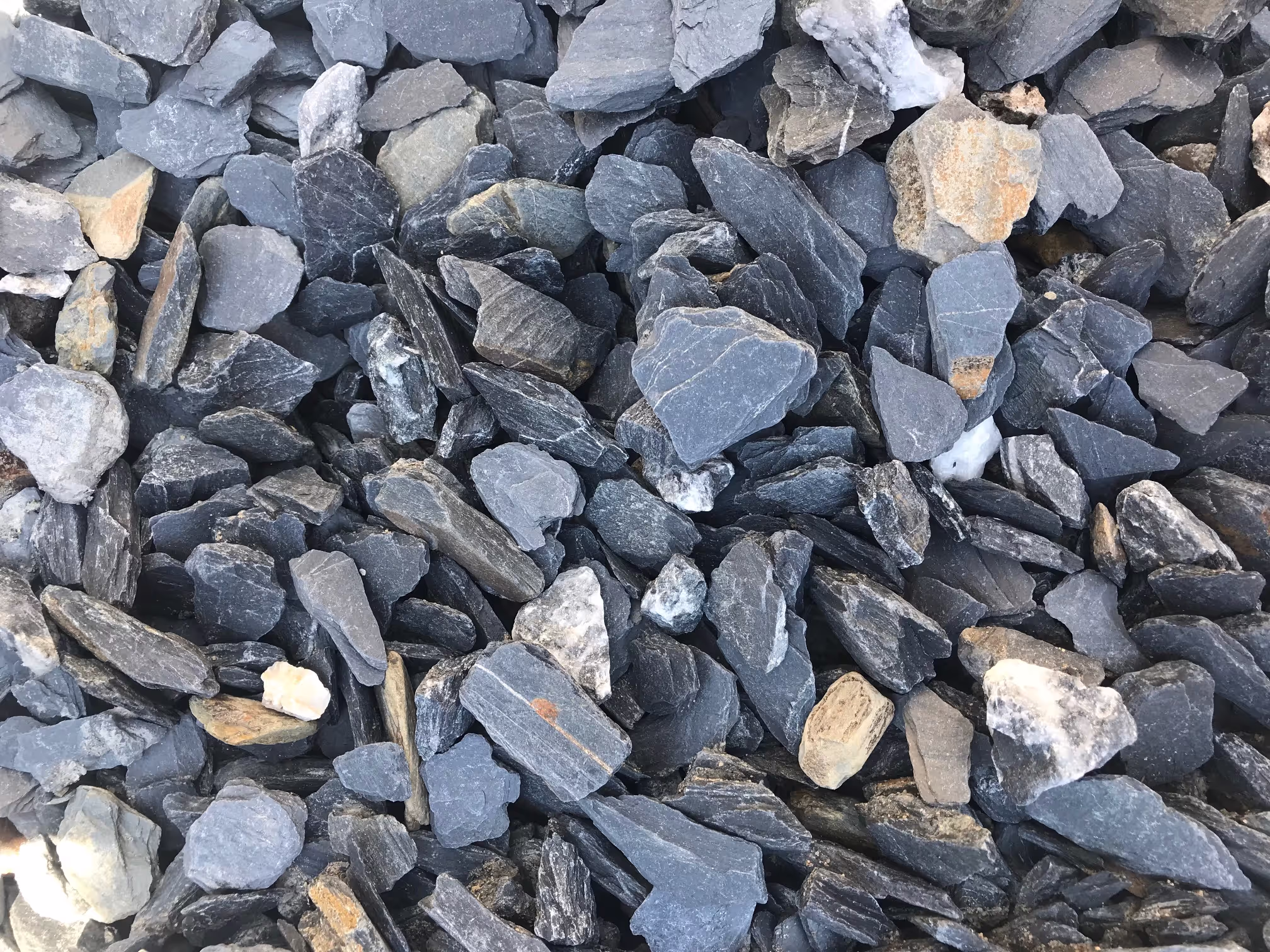 are flat disks of chipped slate that are about 5"-1" across. They have a beautiful dark blue and gray color that will enhance virtually any landscape and are easy to walk on. They lie down flat and pack in well, so they also make a great walkway material. Slate Chips vary in sizes from 1 inch to 3 inches in diameter. Different sizes of slate chips can be used for an array of applications from relaxed walkways and patios, to ground cover and erosion control. The durability in slate chips make for a permanent statement to your landscape.